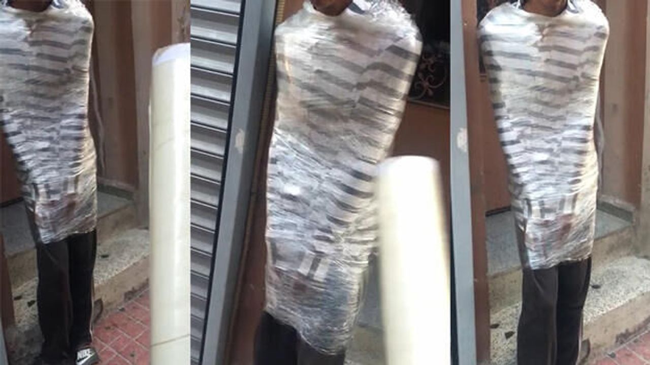 Tüm vücudu streç filmle sarılan çocuk, polise teslim edildi.