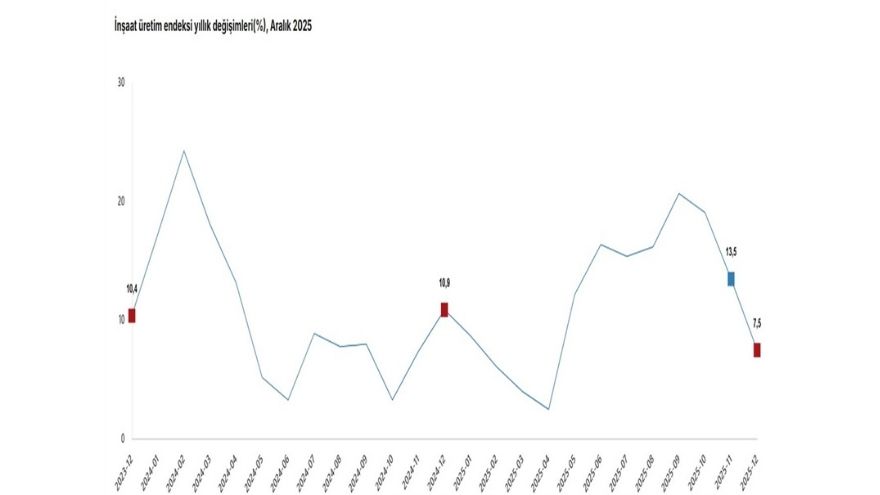 İnşaat üretim endeksi, Aralık 2025'te aylık bazda ise yüzde 1 arttı.