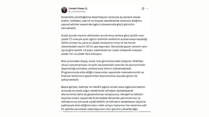 Cumhurbaşkanı Yardımcısı Cevdet Yılmaz, sanal medya hesabından yaptığı açıklamada, dezenflasyon süreciyle eş zamanlı olarak üretim, istihdam, yatırım ve ihracatı destekleyen yapısal adımların etkisini gösterdiğini vurguladı.