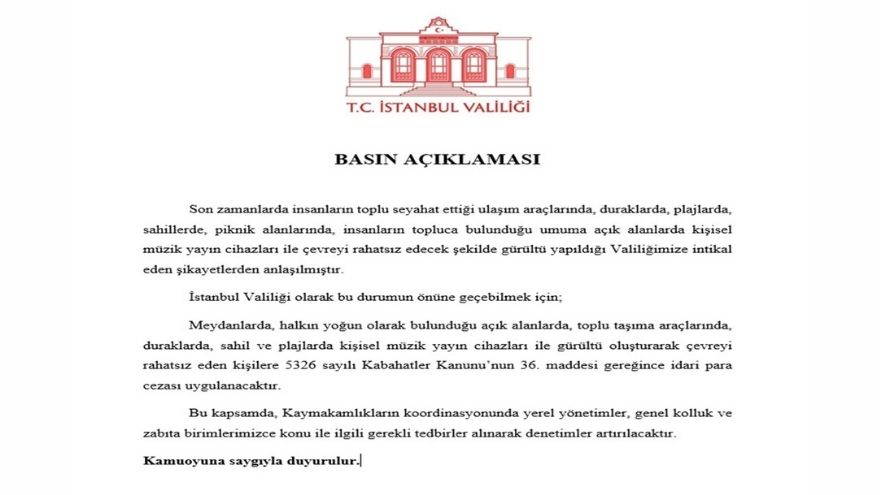 İstanbul Valiliği, gelen yoğun şikayetler doğrultusunda, meydanlar, duraklar, plajlar gibi kamusal alanlarda yüksek sesle müzik dinleyen vatandaşlara para cezası kesileceğini açıkladı.