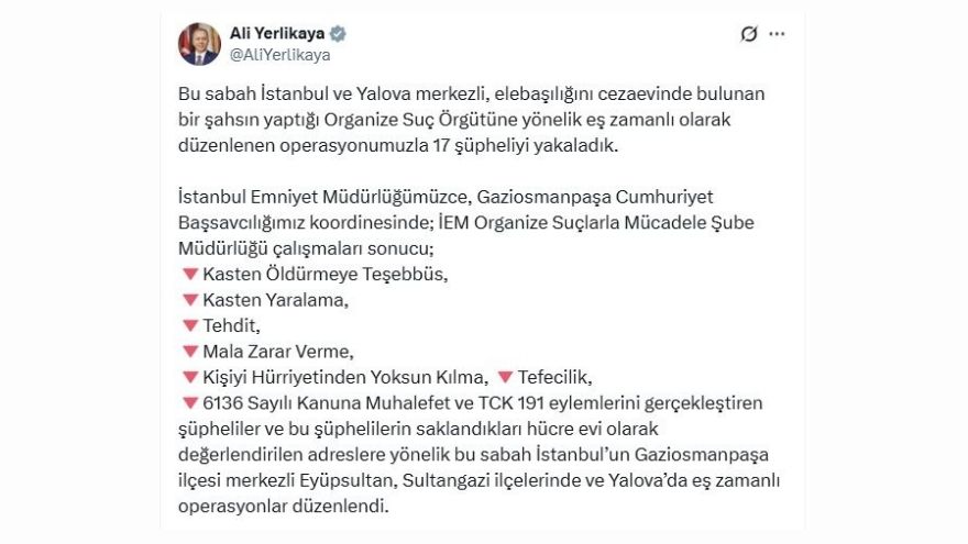 İçişleri Bakanı Ali Yerlikaya, sosyal medya hesabından yaptığı açıklamada, operasyonun İstanbul Emniyet Müdürlüğü ekiplerince yürütüldüğünü belirtti. İstanbul’un Gaziosmanpaşa, Eyüpsultan ve Sultangazi ilçeleriyle Yalova’da eş zamanlı olarak gerçekleştirilen baskınlarda, suç örgütüyle bağlantılı 17 kişinin yakalandığı açıklandı.