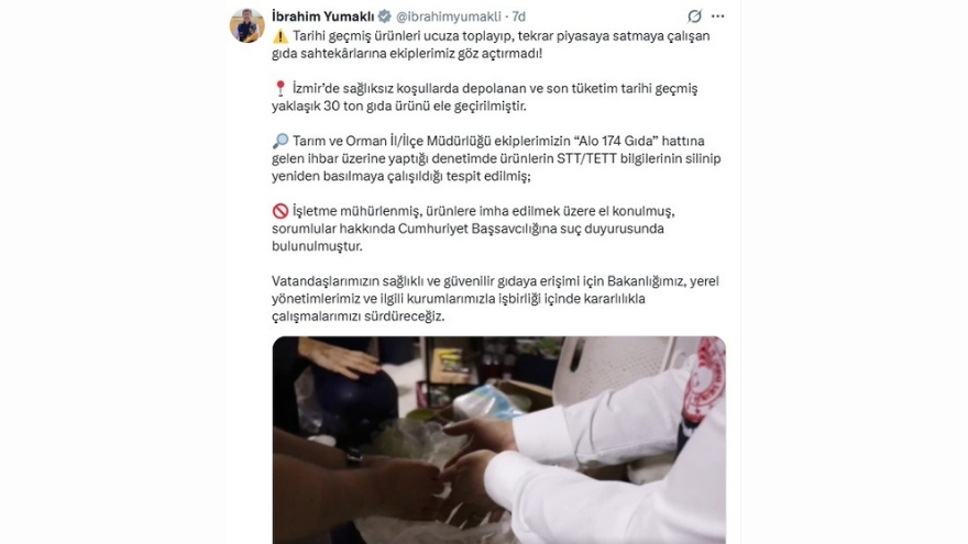 Tarım ve Orman Bakanı İbrahim Yumaklı, yaptığı açıklamada “Tarihi geçmiş ürünleri ucuza toplayıp, tekrar piyasaya satmaya çalışan gıda sahtekarlarına ekiplerimiz göz açtırmadı. İzmir'de sağlıksız koşullarda depolanan ve son tüketim tarihi geçmiş yaklaşık 30 ton gıda ürünü ele geçirilmiştir” ifadelerini kullandı. Yumaklı, vatandaşların güvenilir gıdaya erişimi için denetimlerin aralıksız sürdürüleceğini vurguladı.