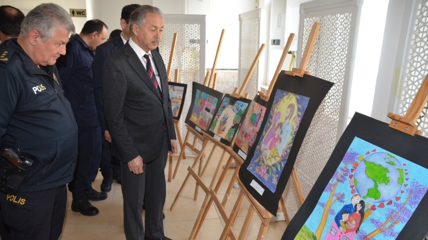 Katılımcılar, öğrencilerin resim çalışmalarını ilgiyle inceleyerek gençlerin yeteneklerini takdir etti.