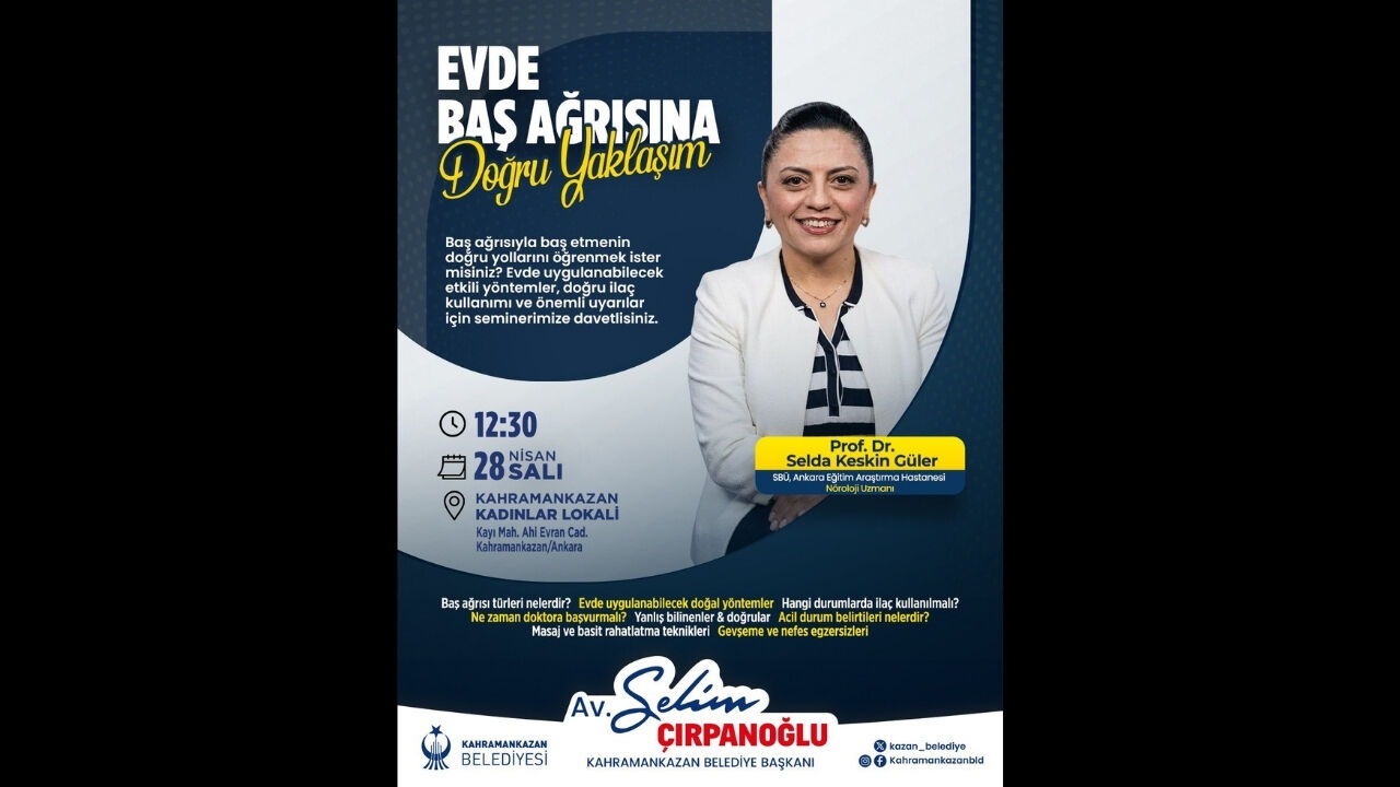 28 Nisan Salı günü Kahramankazan Kadınlar Lokali'nde gerçekleştirilecek olan seminerde, Sağlık Bilimleri Üniversitesi Ankara Eğitim Araştırma Hastanesi Nöroloji Uzmanı Prof. Dr. Selda Keskin Güler konuşmacı olarak yer alacak. Uzman isim, katılımcılara baş ağrısıyla baş etmenin hem bilimsel hem de pratik yollarını anlatarak sıradan bir ağrı ile ciddi bir hastalığın habercisi olan ağrı arasındaki farkları aktaracak.