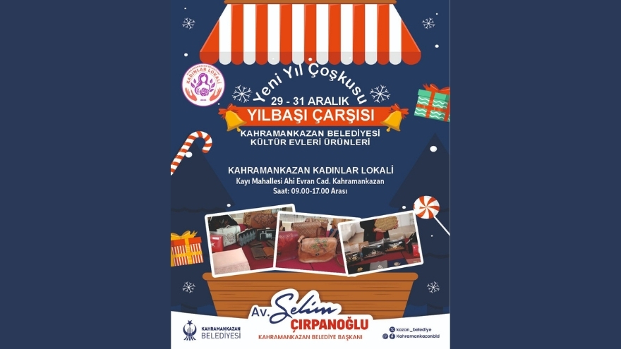 Kahramankazan Belediyesi de “Kahramankazan Belediyesi Kültür Evleri’nin ürünleriyle, el emeği hediyeler 29–31 Aralık tarihleri arasında Kahramankazan Kadınlar Lokali’nde sizlerle” sözleriyle, ilçe halkını Yılbaşı Çarşısı’na davet etti.