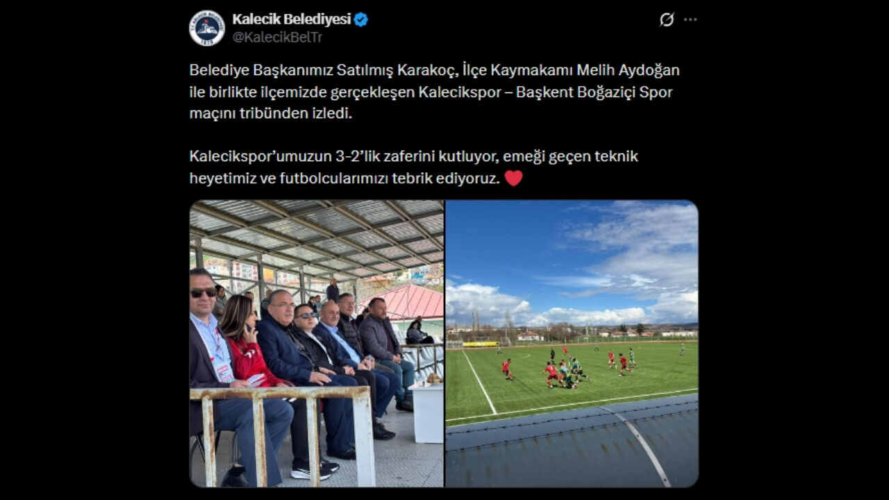 Kalecik Belediyesi’nin sosyal medya hesabından yapılan paylaşımda, “Belediye Başkanımız Satılmış Karakoç, İlçe Kaymakamı Melih Aydoğan ile birlikte ilçemizde gerçekleşen Kalecikspor – Başkent Boğaziçi Spor maçını tribünden izledi” ifadelerine yer verildi.