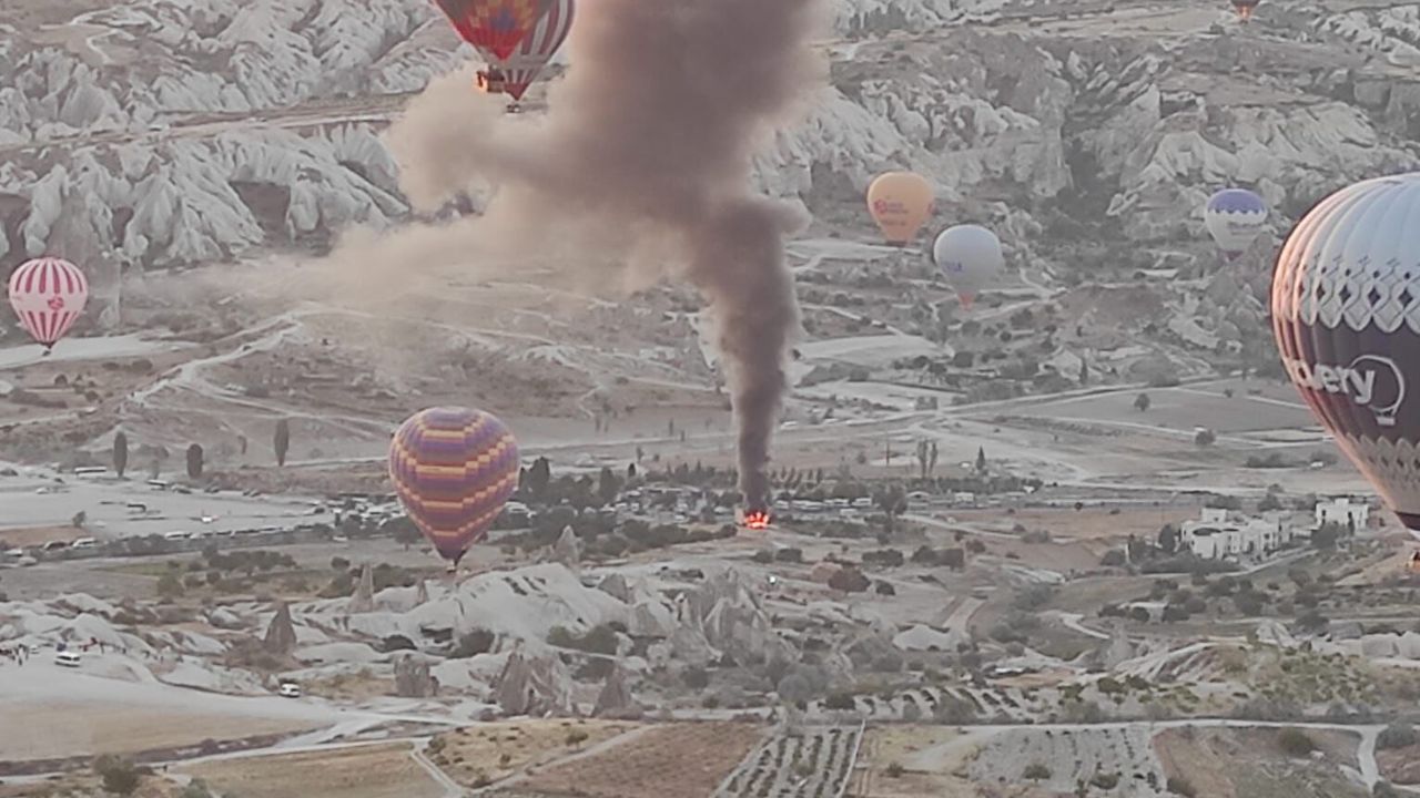 Nevşehir'in Göreme beldesinde turistleri gezdirerek uçuş yapan sıcak hava balonları ise yangında yükselen dumanın içinde kaldı.
