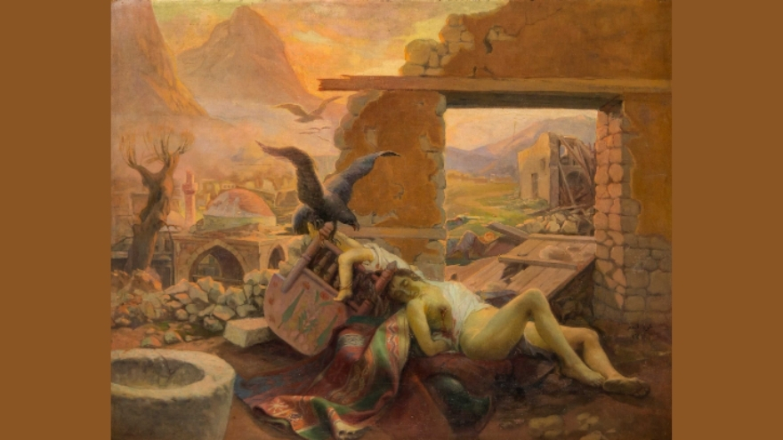 Üzerindeki kilimler ve beşiğin yanında duruşu, ev ve güven ortamının yok oluşunu simgeliyor. Kadın, Türk ulusunun çektiği acının insanlaştırılmış hali.