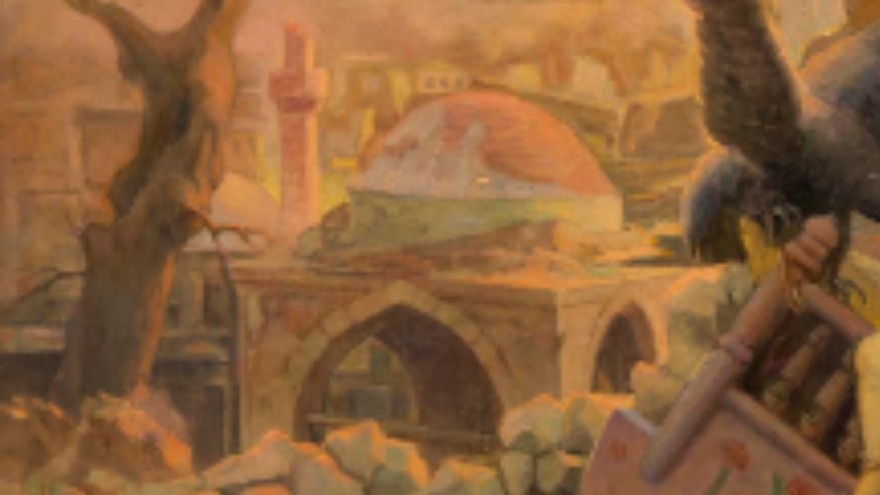 Tablonun arka planında yıkılmış bir köy ve minaresi yıkılmış bir cami yer alıyor. Köy, savaşın fiziksel yıkımını ve halkın acısını gösterirken, kubbesi hala ayakta kalan cami, ulusun direncini ve hayatta kalma iradesini simgeliyor.