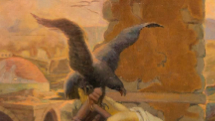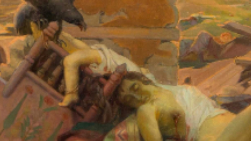 Kadının ve bebeğin üzerinde uçan siyah kartal, düşman güçlerini temsil eder. Diğer gökyüzünden süzülen kartallar, istilacı güçlerin sürekli tehdit oluşturduğunu gösterir.