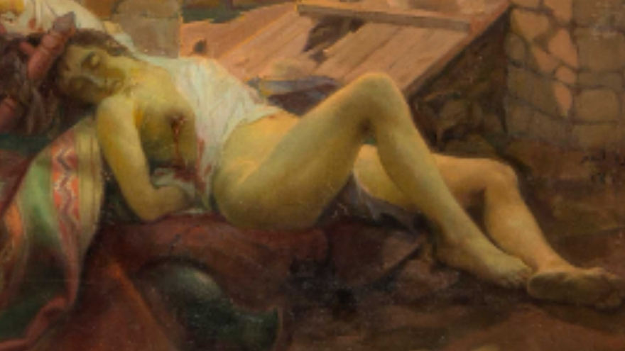 Tablonun merkezinde, giysileri parçalanmış bir kadın yer alıyor. Lifij, kadını savaşın en masum kurbanı olarak tasarlamış.