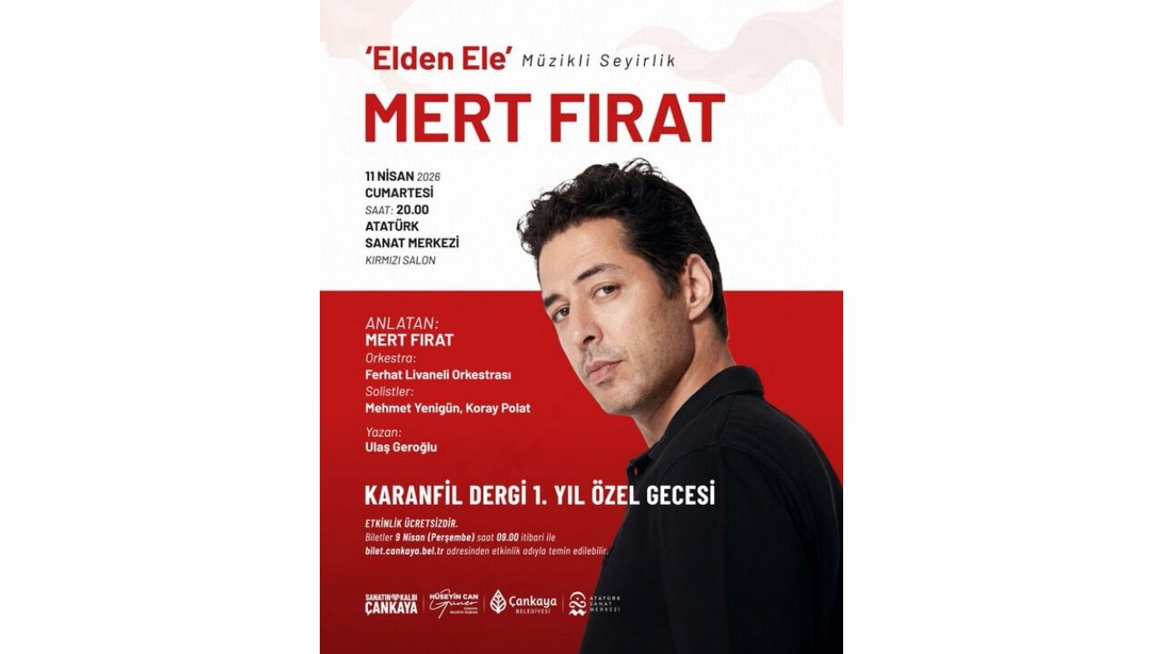 Çankaya Belediyesi, Karanfil Dergi’nin 1. yıl özel gecesine ev sahipliği yapacak etkinliği duyurdu. “Elden Ele” adlı müzikli seyirlik gösteri, sanatçı Mert Fırat’ın anlatımıyla sahnelenecek. Etkinlik Ankara’da sanatseverleri ücretsiz olarak bir araya getirecek özel bir program olarak dikkat çekiyor.