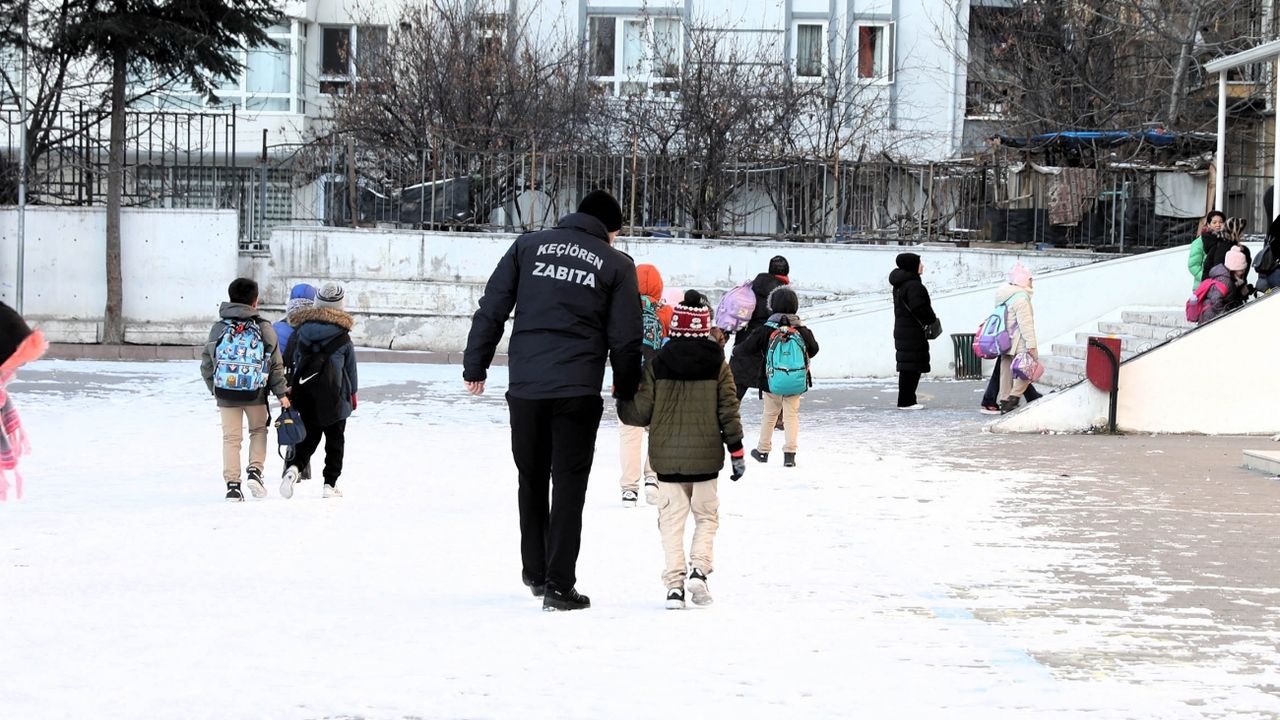 Öte yandan Keçiören Belediyesi Zabıta Müdürlüğü ekipleri de sahada görev alarak olumsuz hava koşulları karşısında okula giden çocuklara destek oluyor.
