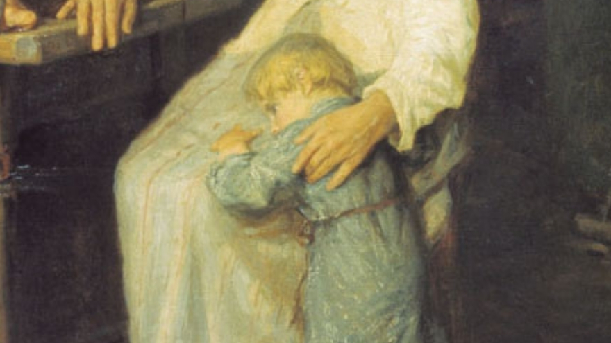 Kadının kucağındaki küçük çocuk ise, gelen adamı tanımadığı için annesine sıkıca sarılmıştır. Tablo, bu üç figür üzerinden sessiz ama sarsıcı bir çatışmayı izleyiciye aktarır.