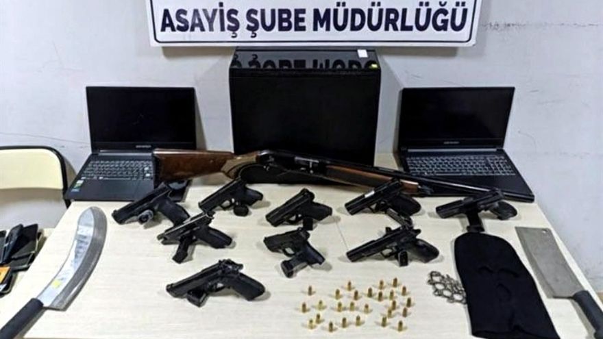 Şüphelilerin adreslerinde yapılan aramalar ve incelemeler sonucunda ruhsatsız 10 tabanca, 24 fişek, 1 tüfek, 8 bıçak, muşta, kar maskesi, 100 gram sentetik bonzai, 1 gram kokain, uyuşturucu hap, 5 gram uyuşturucu madde ile 10 bin 170 lira ele geçirildi.