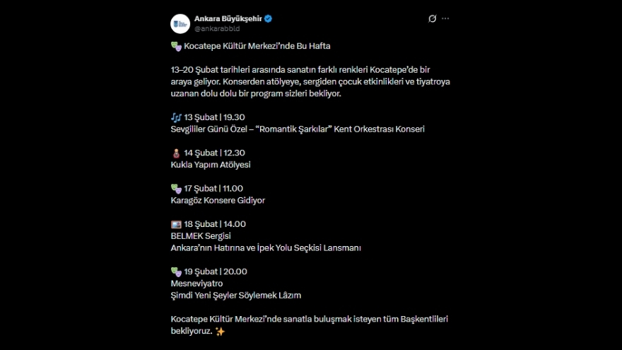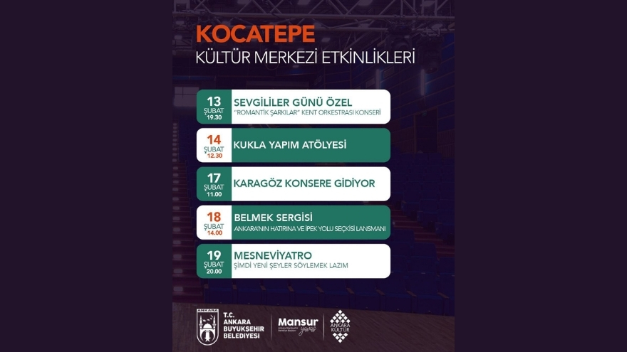 Ankara Büyükşehir Belediyesi tarafından etkinlik haftasına ilişkin yapılan duyuruda, “Kocatepe Kültür Merkezi’nde sanatla buluşmak isteyen tüm Başkentlileri bekliyoruz” ifadelerine yer verildi.