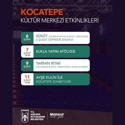 ‘’Kocatepe Kültür Merkezi’nde bu hafta dolu dolu geçiyor. 5-12 Şubat tarihleri arasında Kocatepe Kültür Merkezi, farklı yaş gruplarına hitap eden kültür-sanat etkinliklerine ev sahipliği yapıyor. Tüm Ankaralıları Kocatepe Kültür Merkezi’ne bekliyoruz. Etkinlikler ücretsizdir. Rezervasyonlar Biletinial üzerinden yapılmaktadır.’’