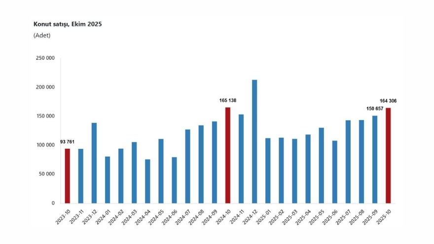 Türkiye İstatistik Kurumu’nun paylaştığı verilere göre ekim ayında Türkiye genelinde konut satışları geçen yılın aynı dönemine göre yüzde 0,5 düşerek 164 bin 306 oldu.