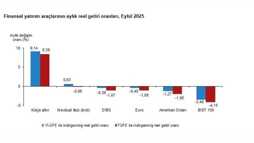 TÜİK’in Eylül 2025 verilerine göre, yatırımcısına en yüksek aylık reel getiri külçe altın oldu. Yurt içi üretici fiyat endeksi (Yİ-ÜFE) ile hesaplandığında yüzde 9,14, tüketici fiyat endeksi (TÜFE) ile indirgendiğinde ise yüzde 8,39 oranında kazandırdı. Diğer yatırım araçları aynı dönemde yatırımcısına kaybettirdi.