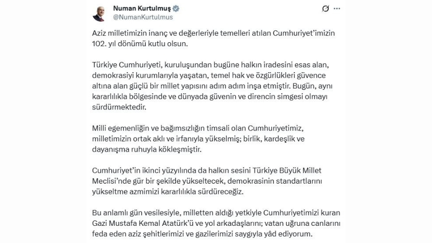 TBMM Başkanı Numan Kurtulmuş, 29 Ekim Cumhuriyet Bayramı dolayısıyla sosyal medya hesabından yayımladığı mesajında, “Aziz milletimizin inanç ve değerleriyle temelleri atılan Cumhuriyetimizin 102'nci yıl dönümü kutlu olsun” ifadelerini kullandı.