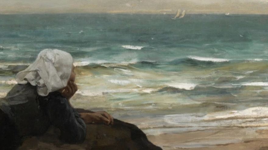 Koyu tonlardaki giysiler, kadının başındaki beyaz örtü ve denizin mavi-yeşil dalgaları umut, sabır ve özlemin sessiz bir anlatısına dönüşüyor.