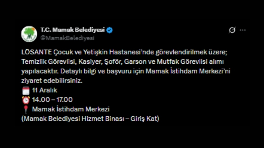 Mamak Belediyesi, yapılan duyuruda LÖSANTE bünyesine personel alımının belediye veya bağlı iştirakler üzerinden yapılmadığını, Mamak İstihdam Merkezi’nin yalnızca yönlendirme rolü üstlendiğini vurguladı.