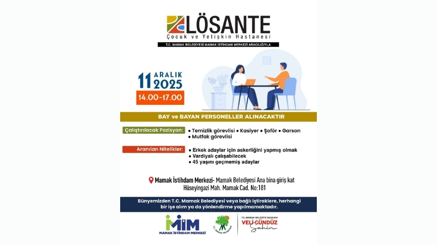 İlgili işe alım görüşmeleri, 11 Aralık Çarşamba günü 14:00 ile 17:00 saatleri arasında, Mamak Belediyesi Ana Hizmet Binası giriş katında yer alan Mamak İstihdam Merkezi'nde yapılacak. Adayların görüşme günü şahsen başvuruda bulunmaları gerekiyor.