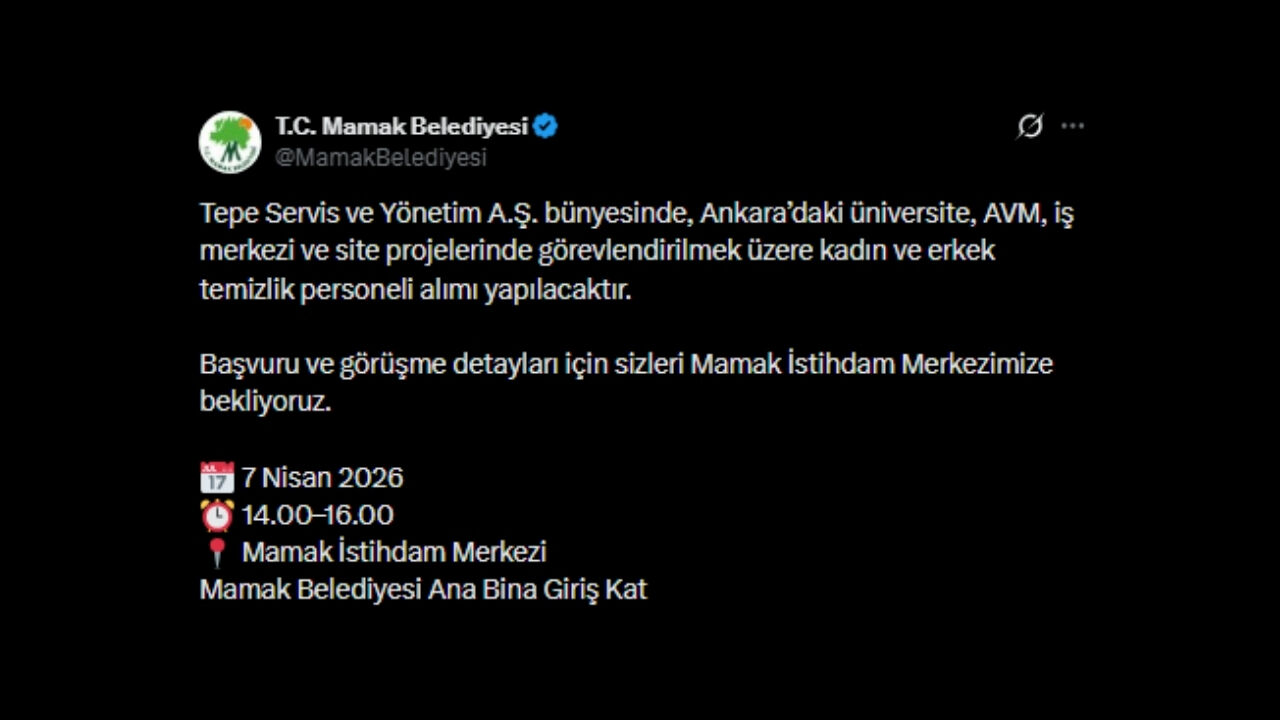 Mamak Belediyesi istihdamı desteklemek amacıyla yeni bir iş fırsatını duyurdu. Tepe Servis ve Yönetim A.Ş. iş birliğiyle gerçekleştirilecek alım kapsamında, Ankara’daki çeşitli projelerde görev alacak temizlik personelleri için başvurular alınacak. Kadın ve erkek adayların katılabileceği görüşmelerin 7 Nisan 2026 tarihinde Mamak İstihdam Merkezi’nde yapılacağı bildirildi.