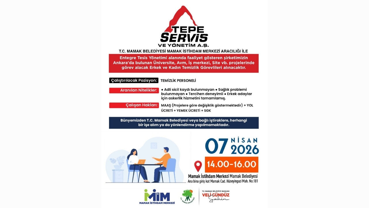 "Tepe Servis ve Yönetim A.Ş. bünyesinde, Ankara’daki üniversite, AVM, iş merkezi ve site projelerinde görevlendirilmek üzere kadın ve erkek temizlik personeli alımı yapılacaktır. Başvuru ve görüşme detayları için sizleri Mamak İstihdam Merkezimize bekliyoruz."