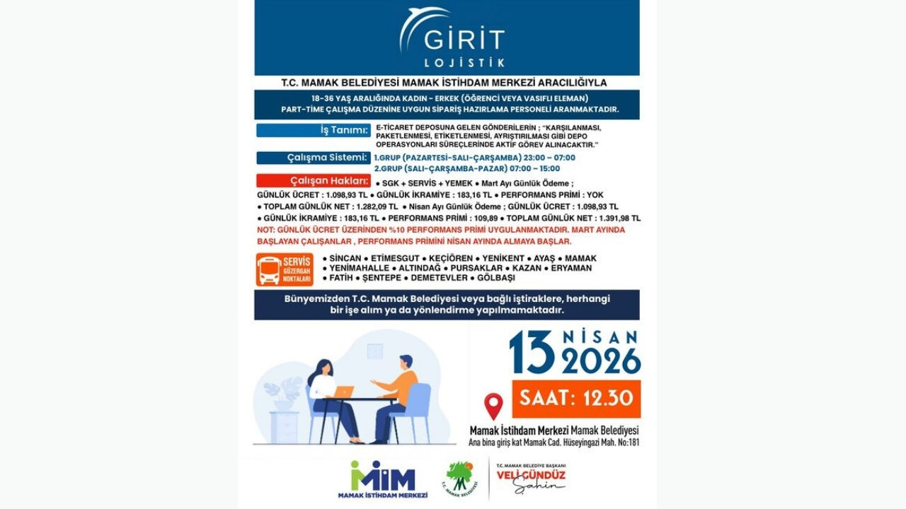 Mamak’ta iş arayanlar için yeni bir istihdam fırsatı gündeme geldi. Belediye aracılığıyla yapılan duyuruya göre, Girit Lojistik bünyesinde görevlendirilmek üzere part-time sipariş hazırlama personeli alımı gerçekleştirilecek. 18-36 yaş aralığındaki adayları kapsayan alım sürecinde, öğrenciler ve vasıflı çalışanlar da başvuru yapabilecek. Belirlenen tarih ve saatte Mamak İstihdam Merkezi’nde gerçekleştirilecek başvurularla birlikte, çalışma şartları, ücret detayları ve servis imkanları da netlik kazandı.