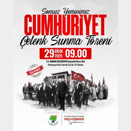 Mamak Belediyesi hizmet binası önünde gerçekleşecek çelenk sunma töreninde, saygı duruşu ve istiklal marşının okunmasının ardından Mamak Belediyesi Bando Takımı’nın vereceği mini konserde Cumhuriyetimizin sevilen marşları seslendirilecek.