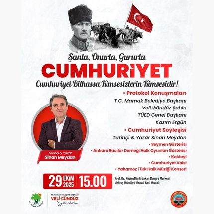 29 Ekim Çarşamba günü saat 09.00’da belediye hizmet binası önünde Çelenk Sunma Töreni ile başlayacak kutlamalar, saat 15.00’te tarihçi-yazar Sinan Meydan’ın katılımıyla Necmettin Erbakan Kongre Merkezi’nde gerçekleştirilecek Cumhuriyet Söyleşisi ile devam edecek.