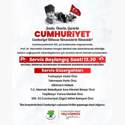Mamak Belediyesi, Necmettin Erbakan Kongre Merkezi’nde gerçekleşecek Cumhuriyet Söyleşisi’ne katılmak isteyen vatandaşlar için ücretsiz servis imkânı sunuyor.
