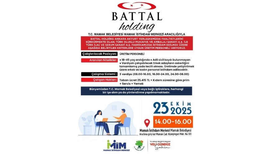 T.C. Mamak Belediyesi Mamak İstihdam Merkezi aracılığıyla yürütülen başvuru süreci kapsamında Battal Holding, üretim kadrolarında çalışacak personellerle birebir görüşmeler yapacak. Adaylar, belirtilen gün ve saatte merkeze gelerek ön mülakatlara katılabilecek.