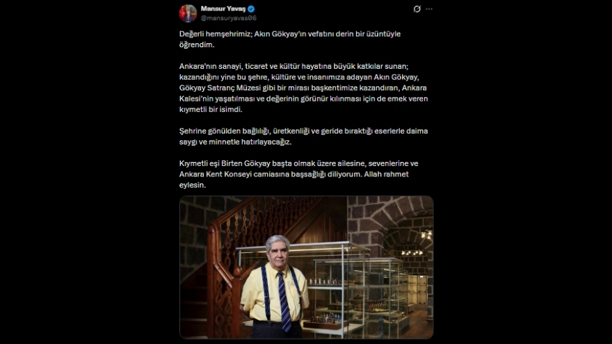 Yavaş, yayımladığı mesajda Gökyay’ın Ankara’nın sanayi, ticaret ve kültür dünyasına sunduğu katkıların kalıcı izler bıraktığını vurguladı. Özellikle Gökyay Satranç Müzesi ile başkente kazandırılan kültürel mirasın önemine dikkat çekilirken, Ankara Kalesi’nin korunması ve görünürlüğünün artırılması için verdiği emeğin de altı çizildi.