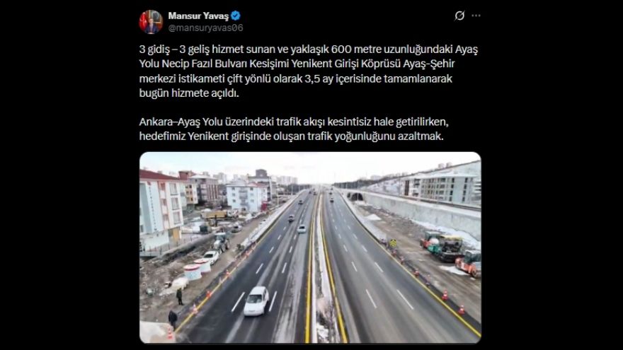 Ankara Büyükşehir Belediye Başkanı Mansur Yavaş, sosyal medya hesabından yaptığı paylaşımla Ayaş Yolu Necip Fazıl Bulvarı Kesişimi’nde yer alan Yenikent Girişi Köprüsü’nün tamamlanarak trafiğe açıldığını duyurdu. Yavaş, paylaşımında şu ifadelere yer verdi: