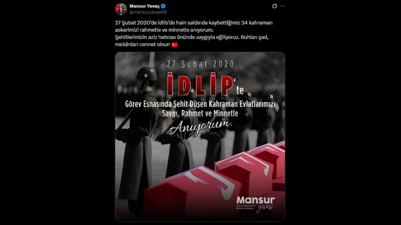 Başkan Yavaş, 27 Şubat 2020’de İdlib’de gerçekleştirilen hain saldırıda şehit düşen kahraman askerleri sosyal medya hesabından andı. Paylaşımında, “Şehitlerimizin aziz hatırası önünde saygıyla eğiliyoruz. Ruhları şad, mekanları cennet olsun” ifadelerine yer verdi.