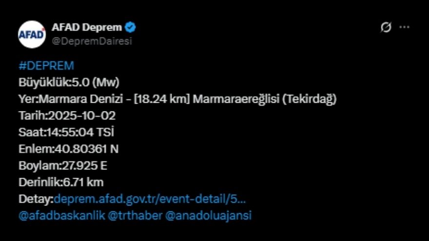 Tekirdağ’ın Marmaraereğlisi ilçesi açıklarında saat 14:55’te meydana gelen 5.0 büyüklüğündeki deprem İstanbul’da da hissedildi.