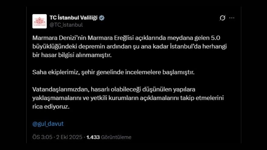 İstanbul Valiliği’nden yapılan açıklamada, “Marmara Denizi’nin Marmara Ereğlisi açıklarında meydana gelen 5.0 büyüklüğündeki depremin ardından şu ana kadar İstanbul’da herhangi bir hasar bilgisi alınmamıştır. Saha ekiplerimiz, şehir genelinde incelemelere başlamıştır. Vatandaşlarımızdan, hasarlı olabileceği düşünülen yapılara yaklaşmamalarını ve yetkili kurumların açıklamalarını takip etmelerini rica ediyoruz” denildi.