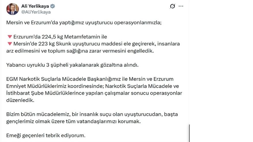 Bakan Yerlikaya, uyuşturucu ile mücadelenin kararlılıkla devam ettiğini vurgulayarak operasyonlarda görev alan polis ekiplerine teşekkür etti.