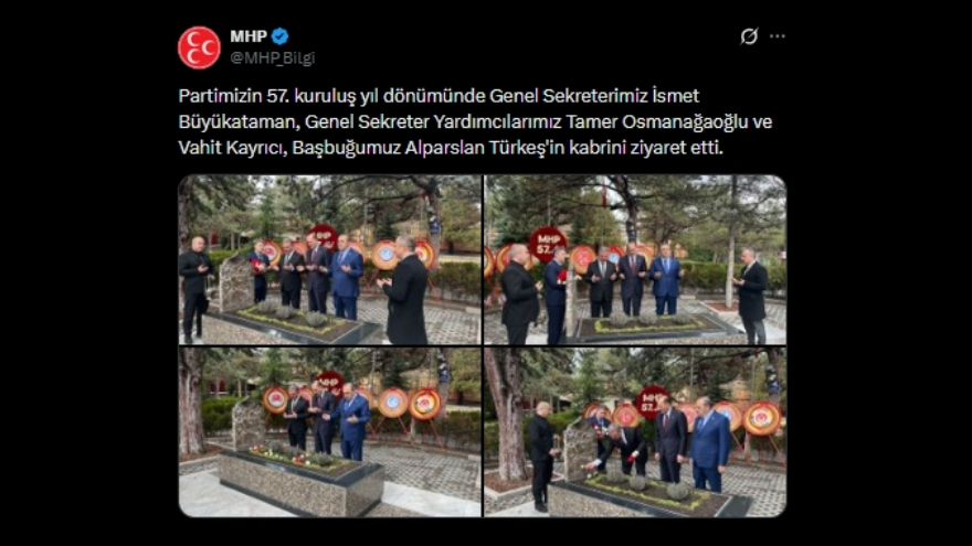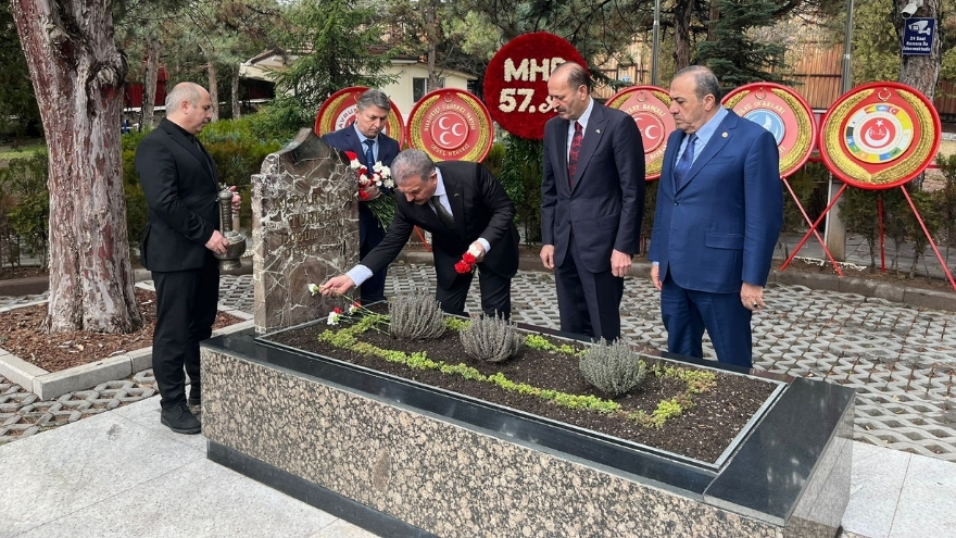 Milliyetçi Hareket Partisi’nin 57. kuruluş yıl dönümü dolayısıyla partinin üst düzey yöneticileri, MHP’nin kurucu lideri Alparslan Türkeş’in kabrini ziyaret etti. Ziyaret, partinin resmi sosyal medya hesabı üzerinden yapılan paylaşımla kamuoyuna duyuruldu.