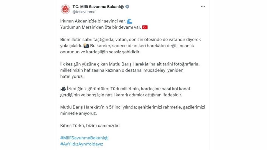 Bakanlık paylaşımında, “Irkımın Akdeniz'de bir sevinci var. Yurdumun Mersin'den öte bir devamı var” dizeleri eşliğinde, harekatın tarihi ve duygusal boyutuna dikkat çekti.