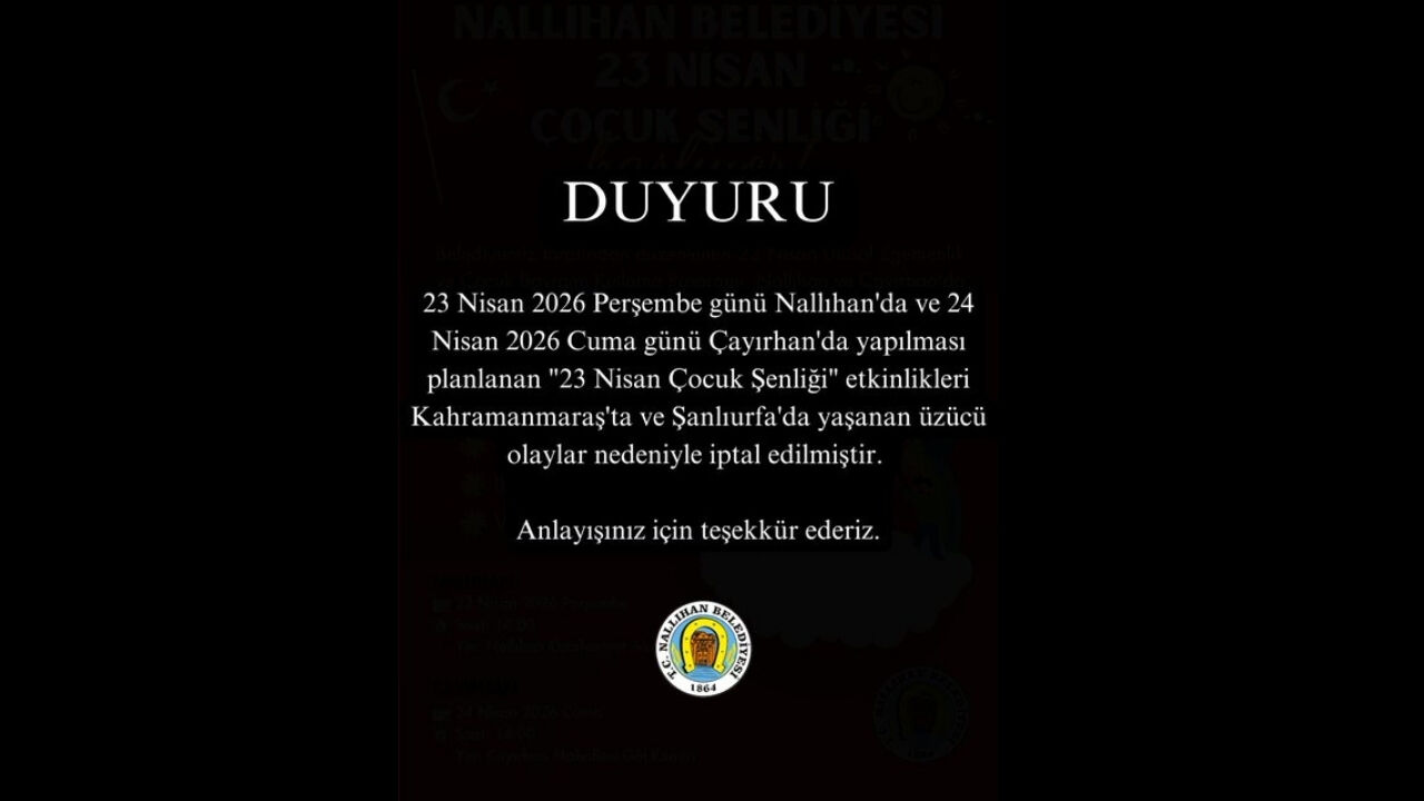 Nallıhan Belediyesi, yapılan bilgilendirmede vatandaşların anlayışına teşekkür ederek, “23 Nisan 2026 Perşembe günü Nallıhan'da ve 24 Nisan 2026 Cuma günü Çayırhan'da yapılması planlanan "23 Nisan Çocuk Şenliği" etkinlikleri Kahramanmaraş'ta ve Şanlıurfa'da yaşanan üzücü olaylar nedeniyle iptal edilmiştir. Anlayışınız için teşekkür ederiz” ifadelerine yer verdi.