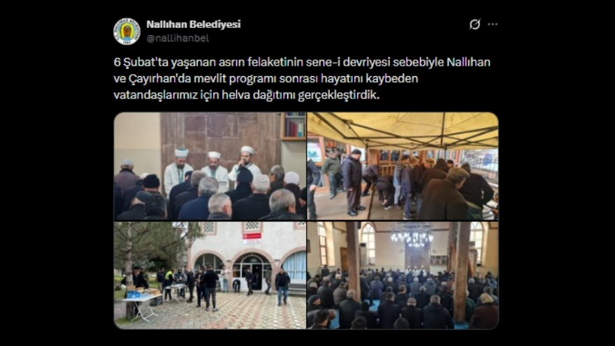 Paylaşıma göre, Nallıhan ve Çayırhan’da düzenlenen program kapsamında Kur’an-ı Kerim okunarak dualar edildi. Depremde yaşamını yitiren vatandaşlar için gerçekleştirilen mevlit programına katılanlar, duygu dolu anlar yaşadı.
