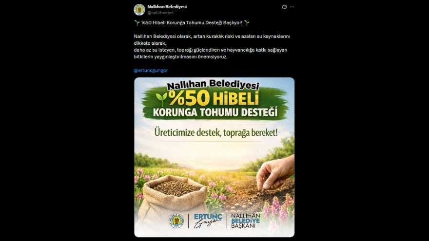 “Yüzde 50 Hibeli Korunga Tohumu Desteği Başlıyor! Nallıhan Belediyesi olarak, artan kuraklık riski ve azalan su kaynaklarını dikkate alarak, daha az su isteyen, toprağı güçlendiren ve hayvancılığa katkı sağlayan bitkilerin yaygınlaştırılmasını önemsiyoruz.”