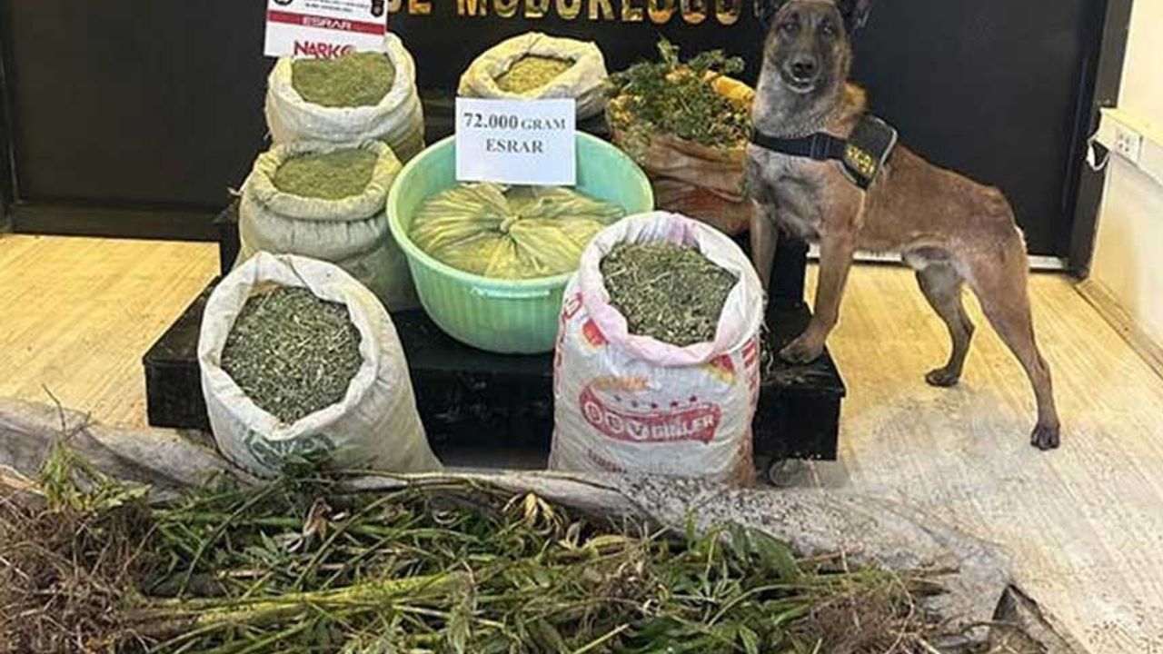Narkotik köpeği 'Rüzgar'ın da katıldığı operasyonda 72 kilo esrar ve 90 kök kenevir bitkisi ele geçirilirken,1 şüpheli gözaltına alındı.