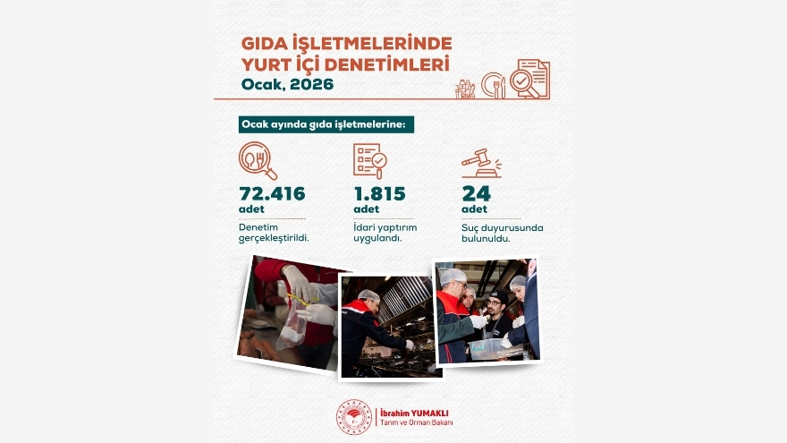 Tarım ve Orman Bakanı İbrahim Yumaklı, sanal medya hesabından yaptığı açıklamada, 1-31 Ocak tarihleri arasında Türkiye genelinde toplam 72 bin 416 gıda denetimi gerçekleştirildiğini duyurdu. Denetimlerin, halk sağlığını koruma hedefiyle titizlikle yürütüldüğü belirtildi.