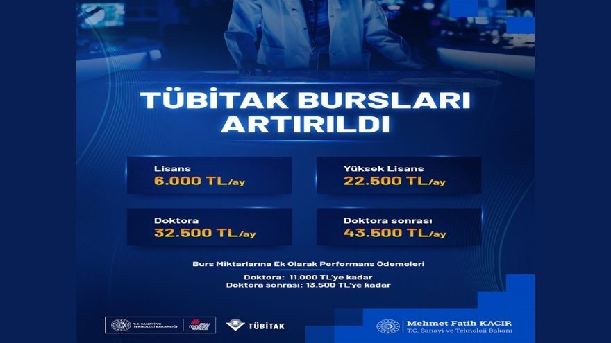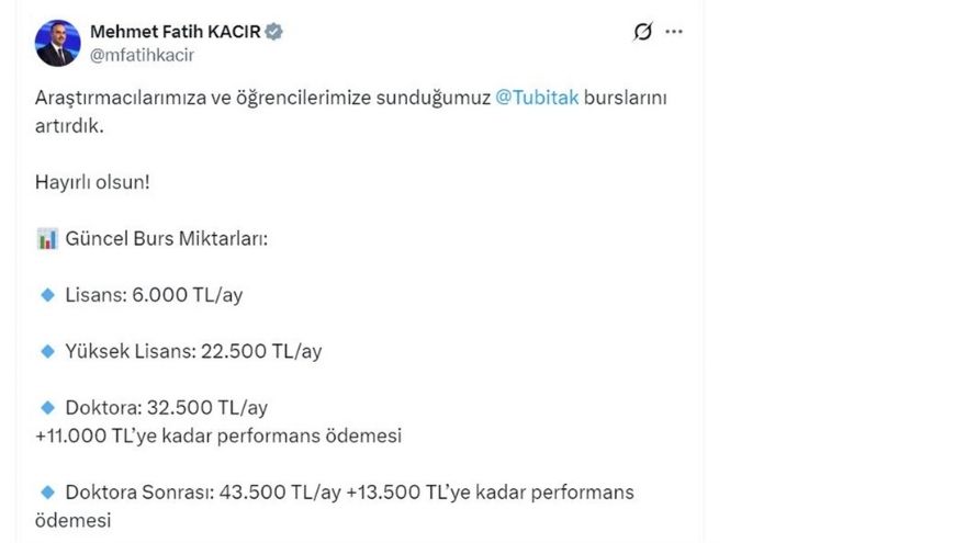 "Araştırmacılarımıza ve öğrencilerimize sunduğumuz TÜBİTAK burslarını artırdık. Hayırlı olsun. Güncel burs miktarları: Lisans öğrencileri için aylık 6 bin TL, yüksek lisans öğrencileri için aylık 22 bin 500 TL, doktora öğrencileri için aylık 32 bin 500 TL’ye ek olarak 11 bin TL’ye kadar performans ödemesi, doktora sonrası araştırmacılar için ise aylık 43 bin 500 TL’ye ek olarak 13 bin 500 TL'ye kadar performans ödemesi"
