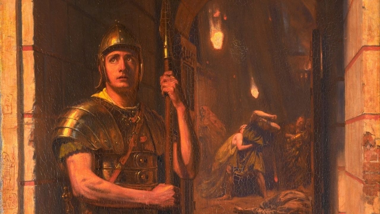 Edward John Poynter'in Ölümüne Kadar Sadık tablosu, MS 79’da Vezüv Yanardağı’nın patladığı Pompeii sahnesini konu alıyor. Kazılarda bulunan tam zırhlı bir askerin cesur şekilde görev yerinde kalması, Poynter’ın resmine ilham kaynağı olmuş.
