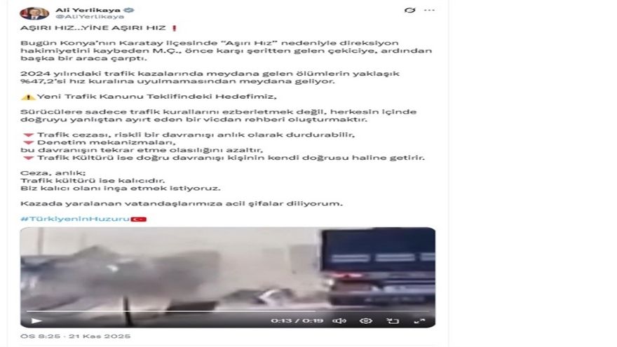 İçişleri Bakanı Ali Yerlikaya, Konya’nın Karatay ilçesinde aşırı hız sonucu direksiyon hakimiyetini kaybeden M.Ç.’nin iki araca çarpmasıyla yaşanan kazaya ilişkin görüntüleri sosyal medya hesabından paylaştı. Yerlikaya, 2024 yılında ölümlü trafik kazalarının yaklaşık yüzde 47,2’sinin hız ihlallerinden kaynaklandığını belirterek, trafik kültürünün önemine vurgu yaptı.